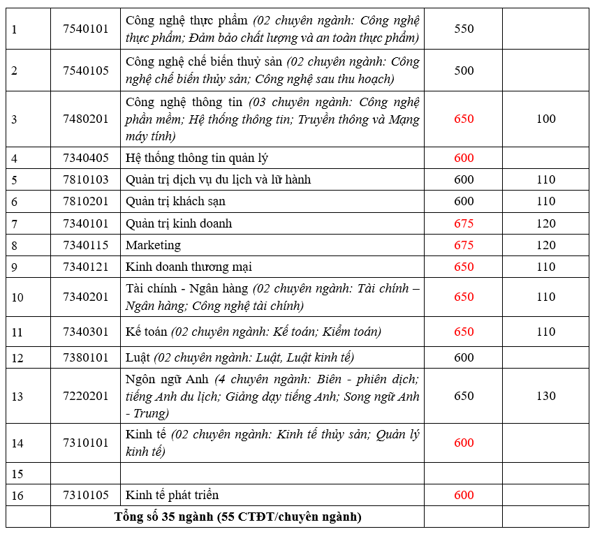 Theo đó, Trường ĐH Nha Trang nhận hồ sơ xét tuyển từ kết quả thi đánh giá năng lực của ĐH Quốc gia TP HCM từ 550 đến 675 điểm. Nhóm các ngành có điểm sàn cao nhất (650 - 675 điểm) gồm: Quản trị kinh doanh, Marketing, Công nghệ thông tin, Kinh doanh thương mại, Ngôn ngữ Anh; Kế toán, Tài chính - Ngân hàng…