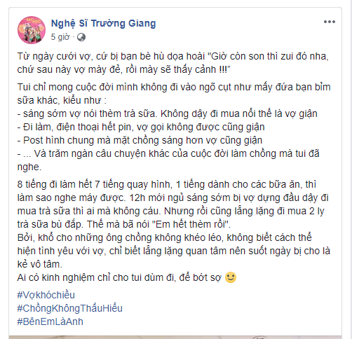 8 tiếng đi làm hết 7 tiếng quay hình, 1 tiếng dành cho các bữa ăn thì làm sao nghe máy được. 12h mới ngủ sáng sớm bị vợ dựng đầu dậy đi mua trà sữa thì ai mà không cáu. Nhưng rồi cũng lẳng lặng đi mua 2 ly trà sữa bù đắp. Thế mà bà nói: "Em hết thèm rồi”. Bởi, khổ cho những ông chồng không khéo léo, không biết cách thể hiện tình yêu với vợ, chỉ biết lẳng lặng quan tâm nên suốt ngày bị cho là kẻ vô tâm. Ai có kinh nghiệm chỉ cho tui dùm đi, để bớt sợ".