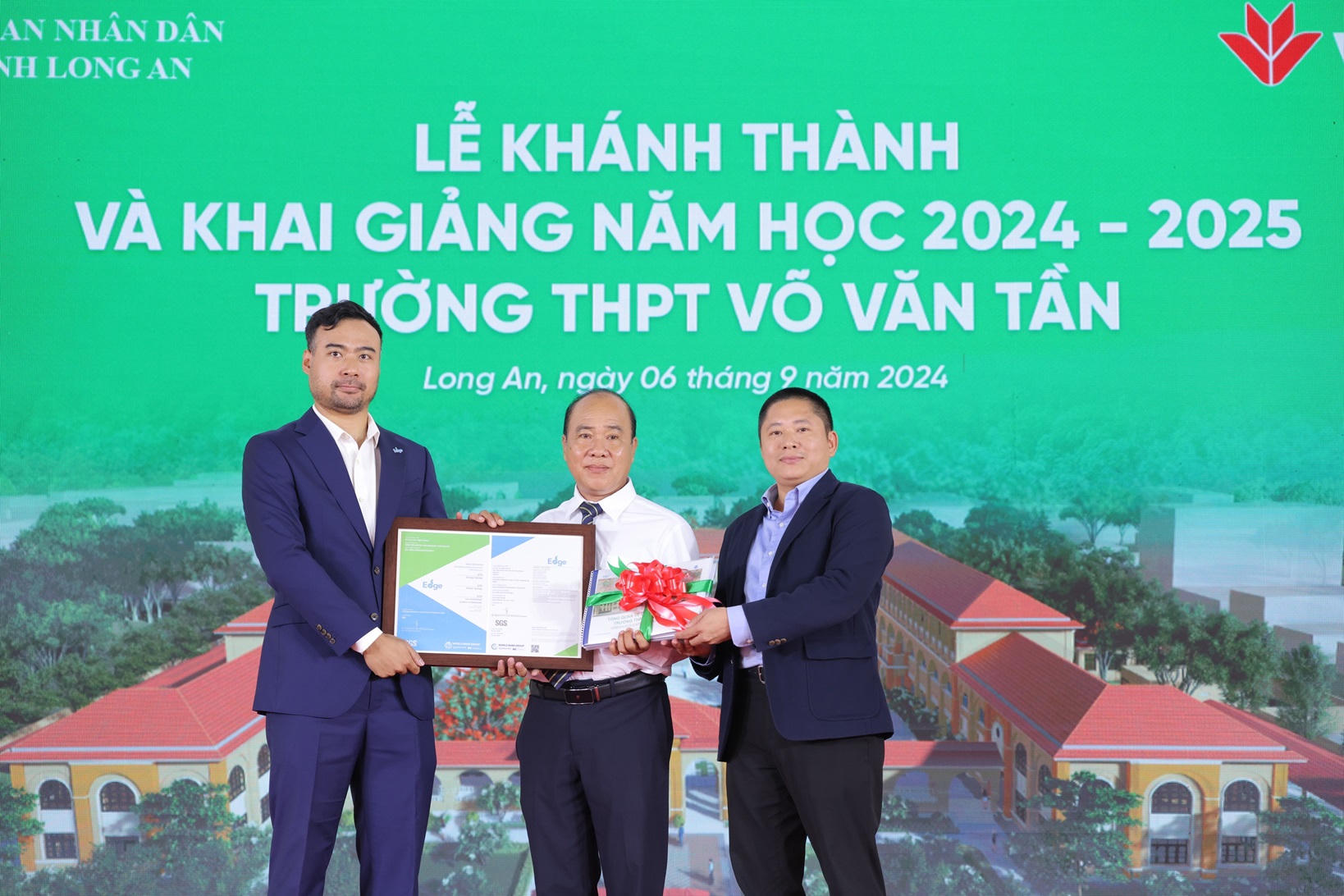 Không chỉ là ngôi trường đạt chuẩn quốc gia với định hướng phát triển theo mô hình trường học chất lượng cao của tỉnh Long An, Trường THPT Võ Văn Tần còn là ngôi trường công lập đầu tiên tại Việt Nam nhận chứng chỉ Công trình xanh EDGE được cấp bởi Tổ chức Tài chính Quốc tế IFC, một thành viên của World Bank Group.