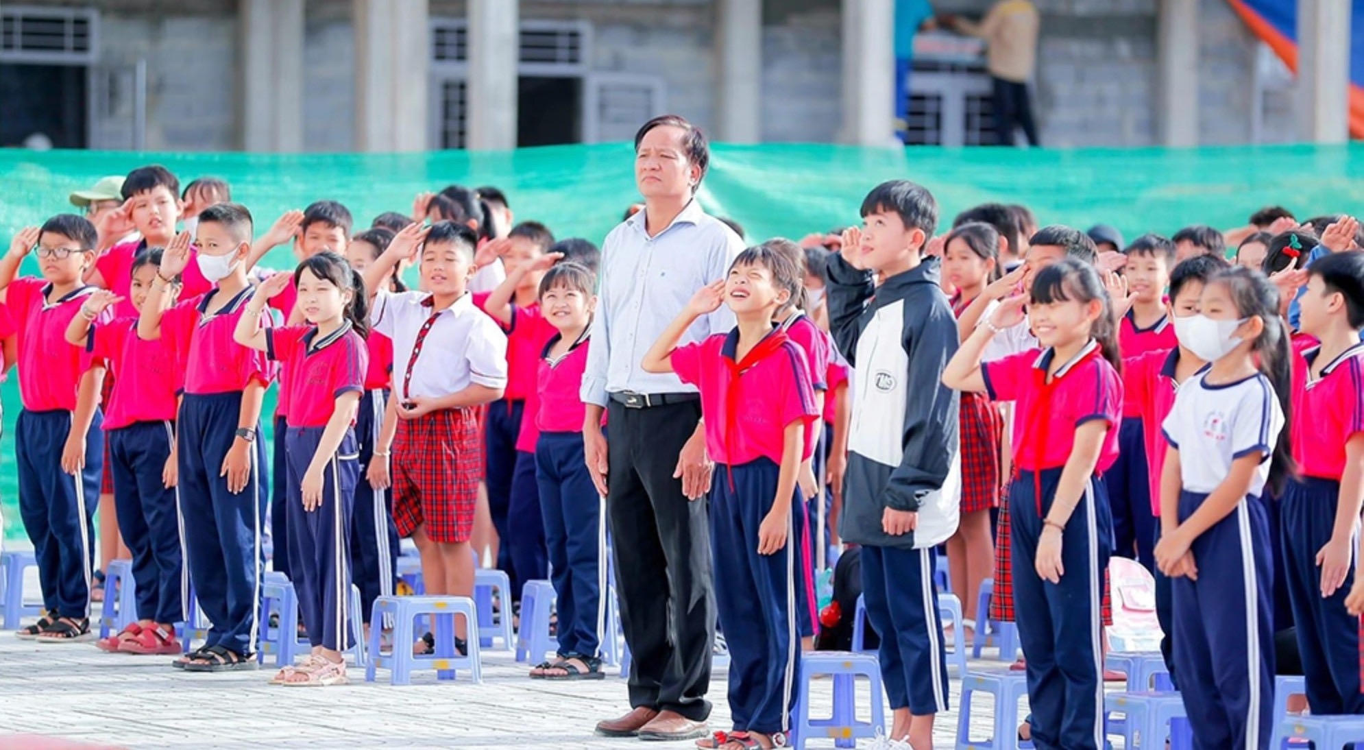 Thầy và trò Trường tiểu học Suối Trầu lần đầu hát Quốc ca chào cờ đầu tuần tại ngôi trường mới |