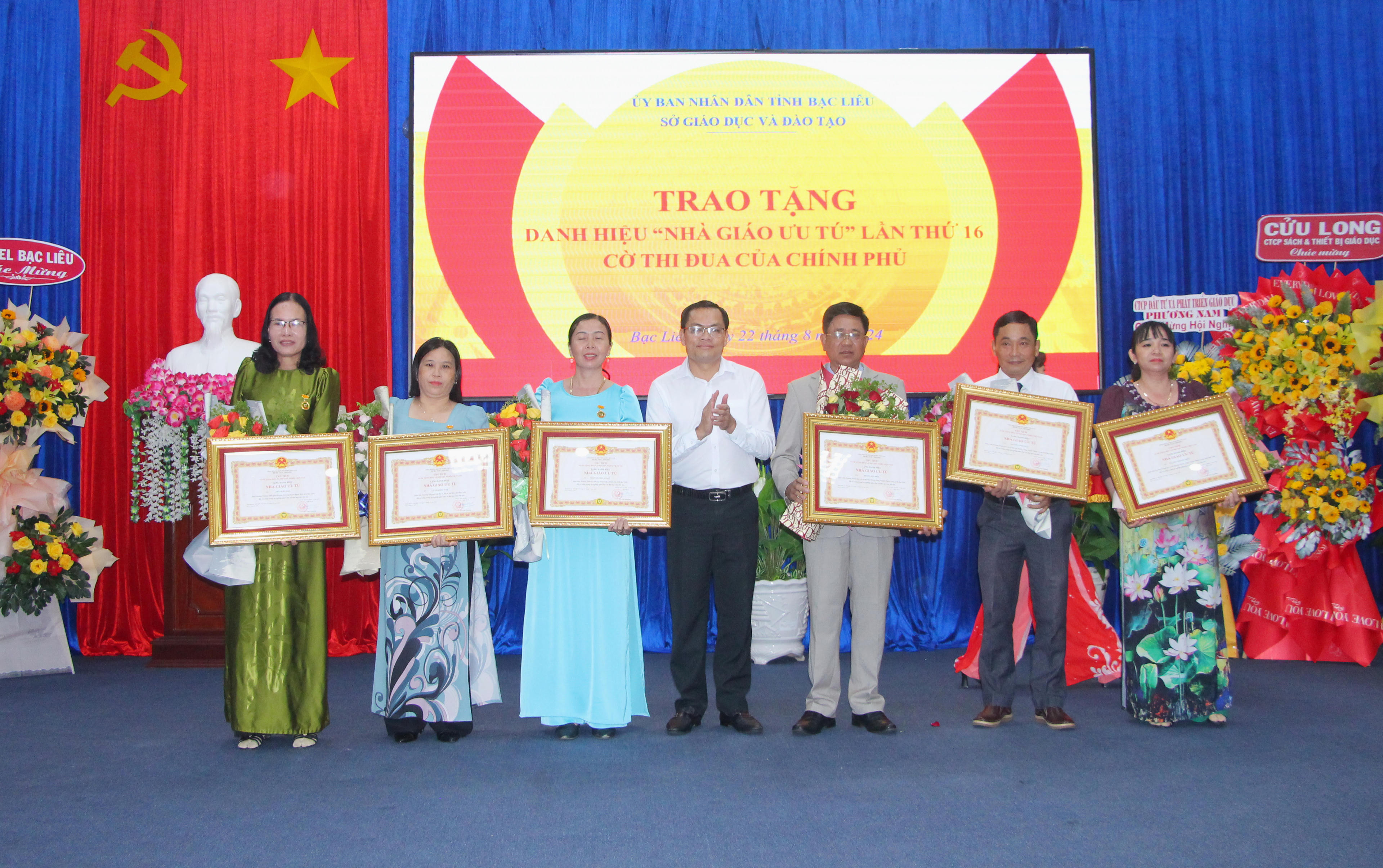 Thừa ủy nhiệm của Chủ tịch nước, ông Ngô Vũ Thăng - Phó Chủ tịch UBND tỉnh Bạc Liêu trao danh hiệu “Nhà giáo ưu tú” cho 6 cá nhân của ngành Giáo dục tỉnh. |