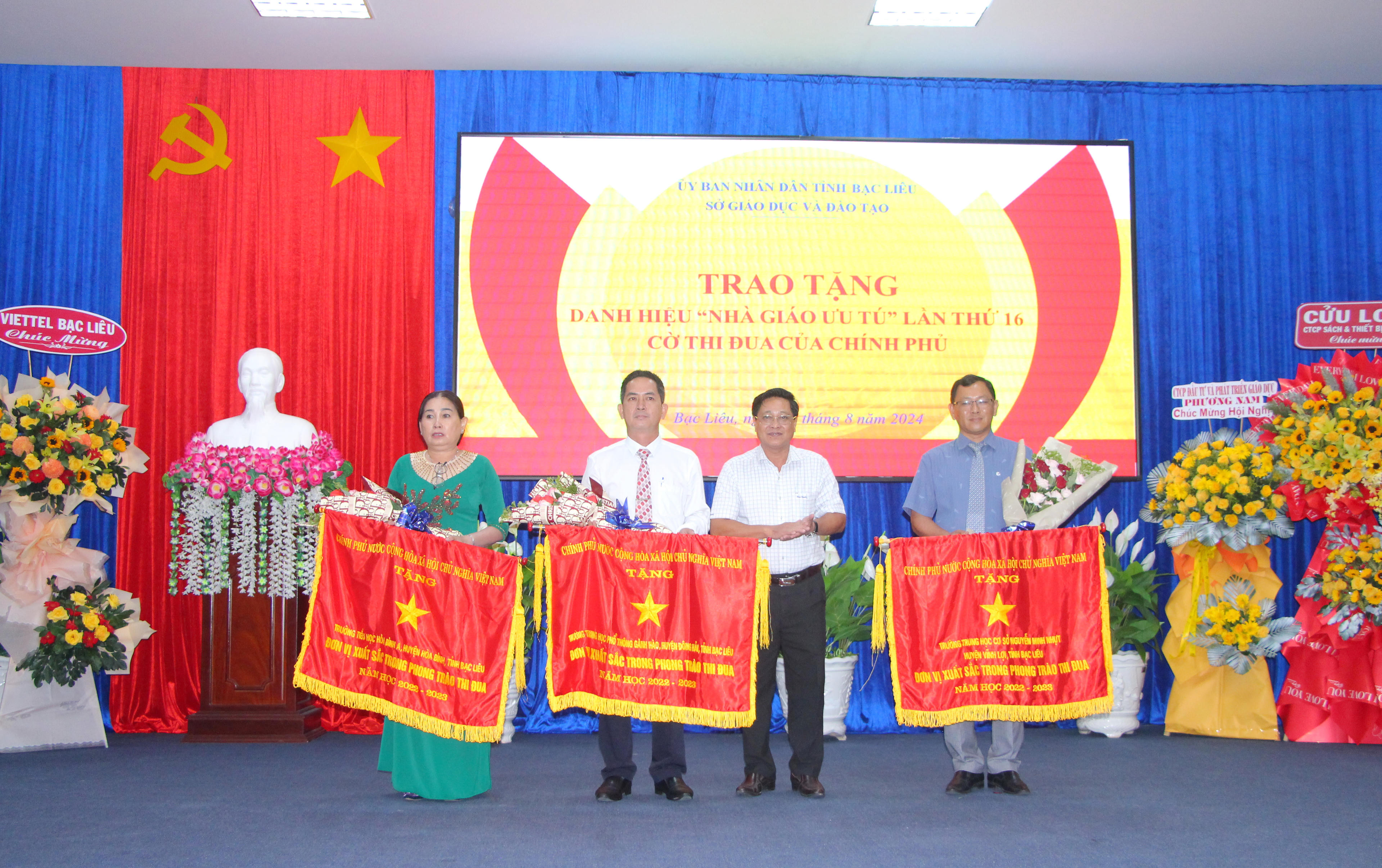 Ông Bùi Tấn Bảy - Phó Chủ tịch HĐND tỉnh Bạc Liêu tặng Cờ thi đua của Chính phủ cho 3 tập thể. |