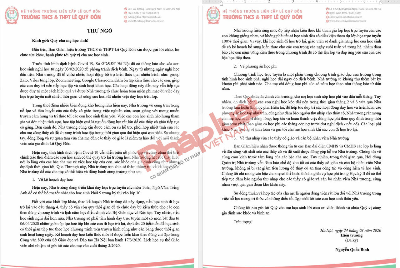 (PLVN) - Trước tình trạng học sinh phải ở nhà suốt 2 tháng qua để phòng dịch Covid -19, Trường THCS và THPT Lê Quý Đôn đã có thư ngỏ trao đổi với phụ huynh về một số vấn đề liên quan đến công tác dạy và học, trong đó có vấn đề học phí. Song, tâm huyết này lại trở thành cái cớ để Trường bị hoạch họe việc “nghỉ học mà vẫn phải nộp học phí”. Báo Pháp luật Việt Nam đã trao đổi với Trường và sự thật khác xa với những gì mà một số ý kiến phụ huynh đã phản ánh.