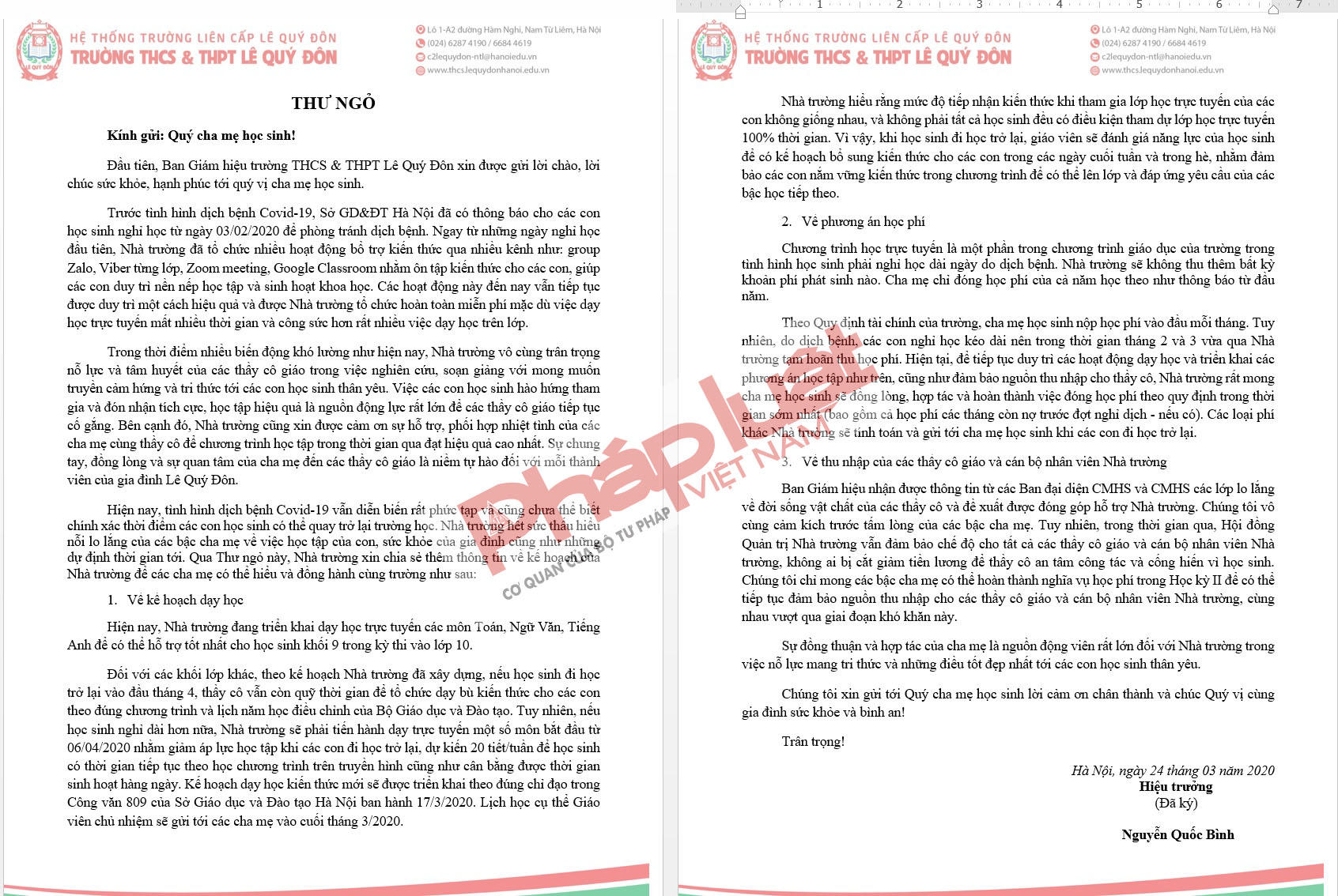 Ngày 24/3, Hiệu trưởng Trường THCS và THPT Lê Quý Đôn Nguyễn Quốc Bình đã công bố thư ngỏ trên trang web của Trường. Nội dung thư ngỏ gửi các phụ huynh đề cập đến việc việc khắc phục khó khăn trước mắt do dịch bệnh Covid-19 và các giải pháp thực hiện kế hoạch năm học 2019-2020.