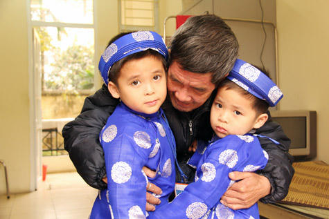 | Cụ ông năm nay gần 100 trăm tuổi cảm động ôm chặt hai bé đã mang Tết ấm đến với những người già neo đơn. |