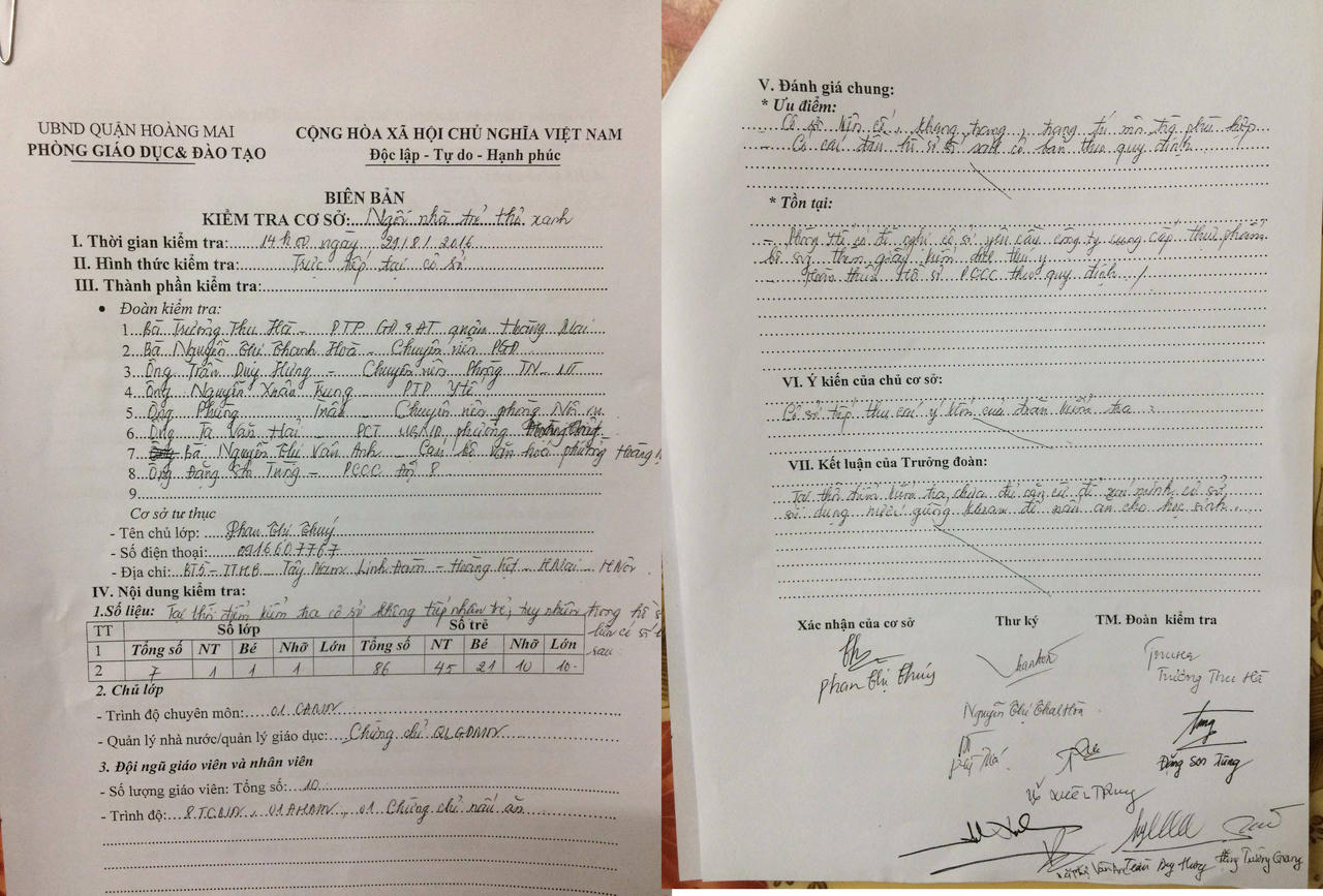 Cụ thể, theo bà Trương Thu Hà, Phó Trưởng phòng Giáo dục và Đào tạo (GD&ĐT) quận Hoàng Mai cho biết, Phòng GD&ĐT phối hợp với Phường Hoàng Liệt đã xuống kiểm tra đột xuất CSMN Baby’s House để xác minh thông tin mà báo chí đã phản ánh đồng thời yêu cầu cơ sở dừng tiếp nhận trẻ, đình chỉ hoạt động theo quyết định của UBND Phường Hoàng Liệt ngày 25/8.