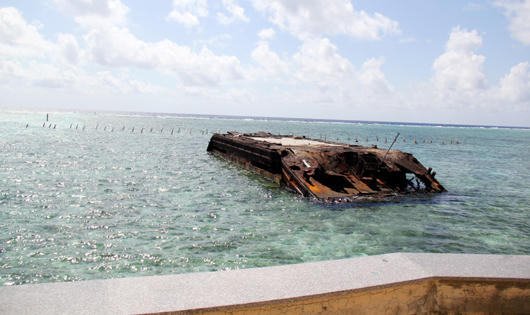| Chiếc bông-tông trên Đá Lớn B, dấu tích còn lại của thuở ban đầu những người lính công binh tới đây xây dựng đảo chìm. |