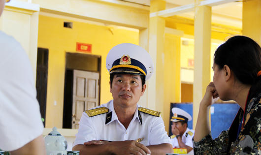 | Đại tá Đinh Văn Dũng, Chính ủy căn cứ 696, vùng 2 Hải quân, đang kể chuyện về Trường Sa với các phóng viên. |