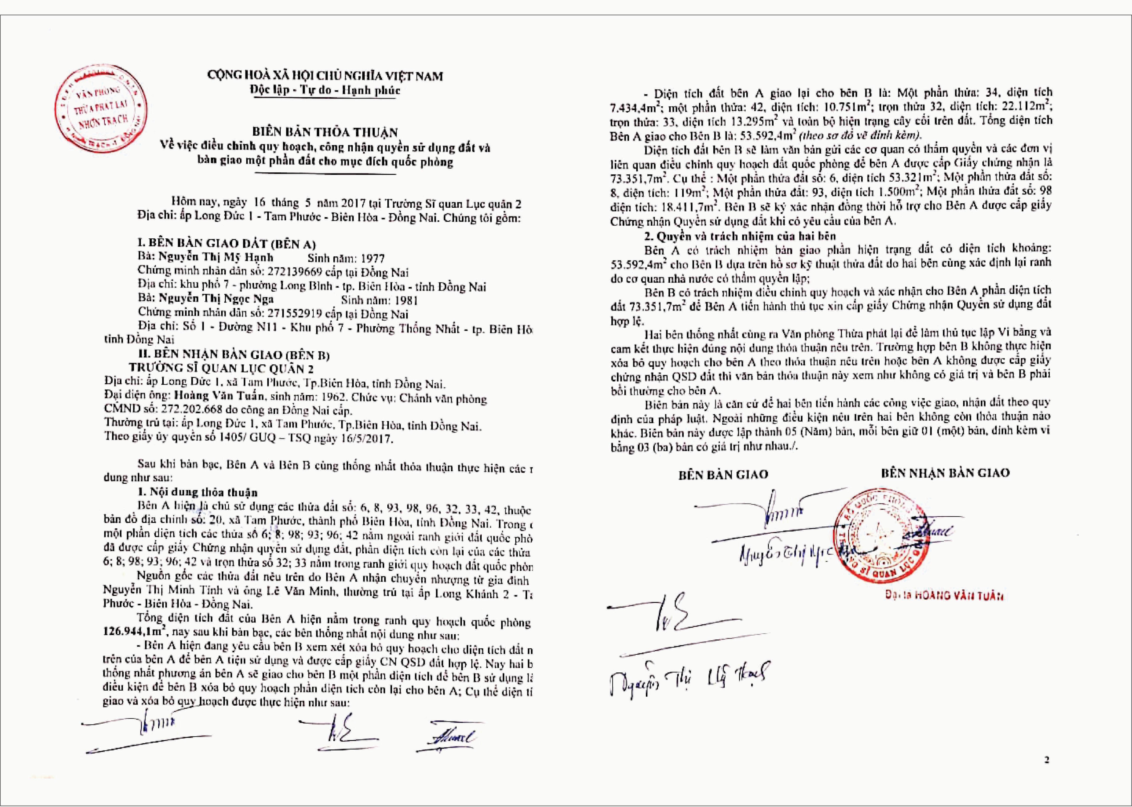 Ngày 16/5/2017, bà Hạnh và bà Nga cùng ký với Đại tá Hoàng Văn Tuấn - Chánh văn phòng Trường Sĩ quan Lục quân 2 cái gọi là “biên bản thỏa thuận về điều chỉnh quy hoạch, công nhận sử dụng đất và bàn giao một phần đất cho mục đích quốc phòng”.