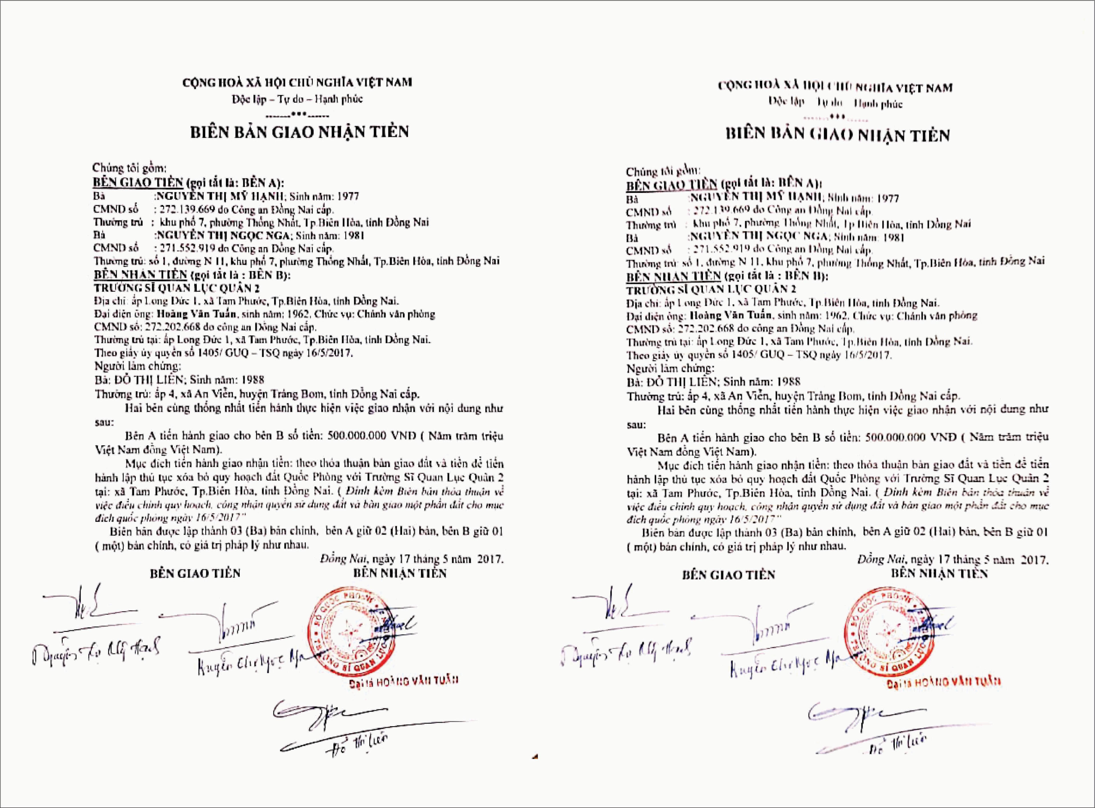 Đáng nói, để có trong tay biên bản thỏa thuận nói trên, bà Hạnh và bà Nga phải chi cho Trường Sĩ quan Lục quân 2 thêm 500 triệu đồng và số tiền này nhanh chóng được bàn giao cho đại diện nhà trường ngay vào ngày hôm sau, 17/5/2017.