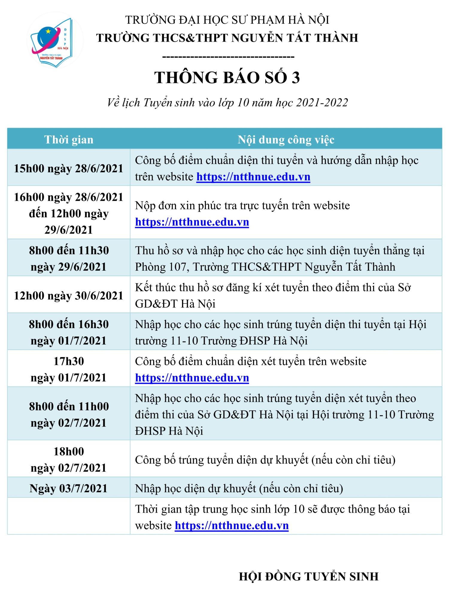 Lich tuyển sinh vào lớp 10 năm học 2021- 2022 của trường THCS&THPT Nguyễn Tất Thành: