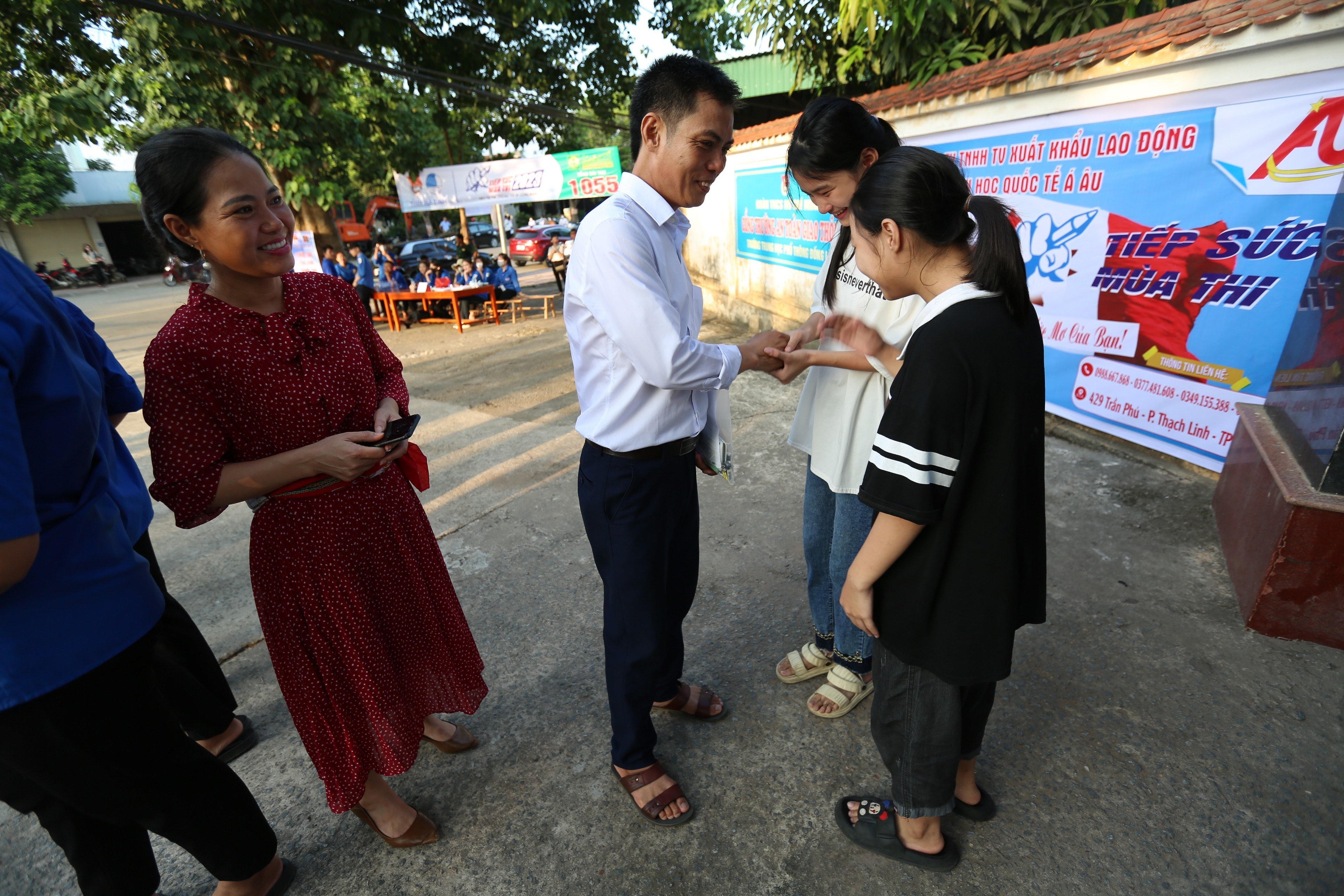Ông Đặng Văn Ảnh được hai đứa con động viên trước giờ vào làm bài thi. Ảnh: HA |