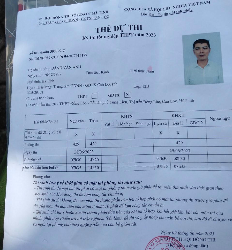 Sáng 28/6, cùng với hơn 17.000 thí sinh tại 35 điểm thi ở Hà Tĩnh bước vào môn thi đầu tiên Kỳ thi tốt nghiệp THPT năm 2023, ghi nhận tại điểm thi trường THPT Đồng Lộc (thị trấn Đồng Lộc, huyện Can Lộc, Hà Tĩnh) có thí sinh khá “đặc biệt” bước sang tuổi 46 háo hức tham dự kỳ thi tốt nghiệp THPT - đó là thí sinh Đặng Văn Ảnh, Trưởng thôn Liên Tài Năng, xã Tùng Lộc, huyện Can Lộc.