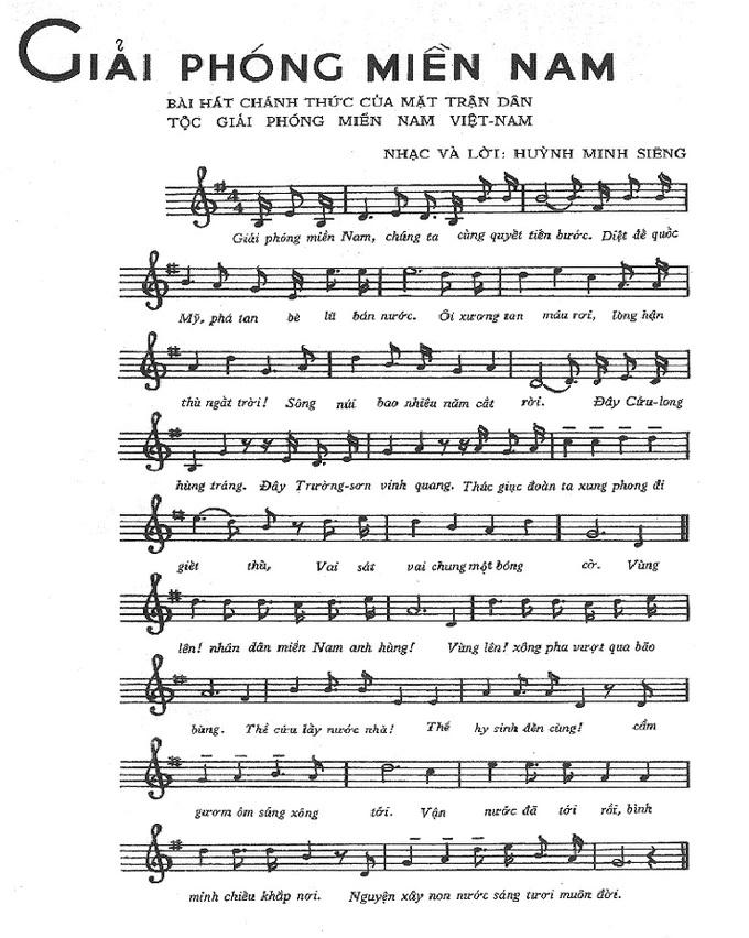 Còn trong ca khúc “Giải phóng miền Nam” của nhạc sĩ Lê Hữu Phước thể hiện ý chí thống nhất đất nước, toàn dân dưới sự lãnh đạo duy nhất của Ðảng, bài hát có câu: “Vai sánh vai, chung một bóng cờ”. Ðiệp khúc của bài hát là những câu đầy hình ảnh, phản ánh sự tin tưởng tuyệt đối của Nhân dân miền Nam vào chiến thắng cuối cùng bằng câu: Vận nước đã đến rồi bình minh chiếu khắp nơi, Nguyện xây non nước sáng tươi muôn đời... “Giải phóng Miền Nam” được chọn làm quốc ca của Chính phủ Cách mạng lâm thời Cộng hòa miền Nam Việt Nam.