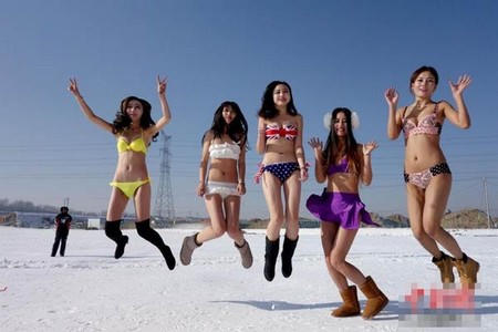 Một khu du lịch trượt tuyết tại Trung Quốc đã có cách đặc biệt để thu hút sự chú ý của du khách bằng cách thuê 20 cô gái xinh đẹp cùng đến đây và trượt tuyết trong trang phục bikini.