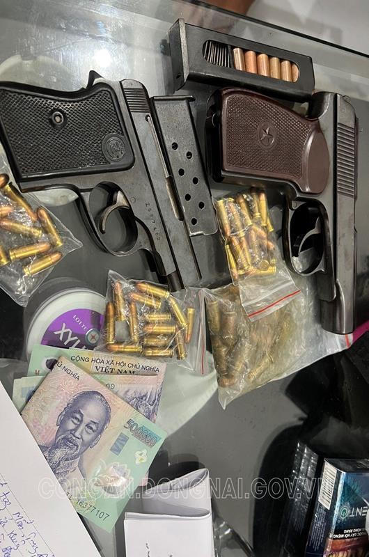 Tại nơi ở của hai đối tượng, công an thu giữ 1 khẩu súng, 8 viên đạn, trong đó 1 viên đã lên nòng và 13 viên đạn bên ngoài; môt bịch ni long bên trong chứa chất màu trắng nghi là ma túy.