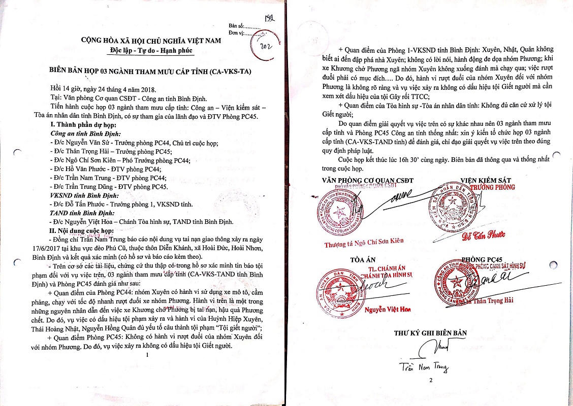 Ngày 7/12/2017, tại Phòng PC45, Công an tỉnh Bình Định diễn ra cuộc họp 3 ngành gồm TAND tỉnh, VKSND tỉnh và Công an tỉnh Bình Định. Theo nội dung biên bản: Quá trình điều tra chưa làm rõ như xác định hành vi của nhóm Xuyên có rượt đuổi hay không rượt đuổi nhóm Phương. Cần xác định thời điểm nhóm Phương phát hiện nhóm Xuyên ở phía sau là khi nào, tại địa điểm nào và từ đó đến nơi xảy ra tai nạn là bao nhiêu mét? Từ vị trí xe Thi chở Lâm bị tai nạn đến chỗ xe Khương chở Phương bị tai nạn là bao xa? Dựng lại hiện trường theo lời khai của các nhân chứng để làm rõ tổng thể vụ án.