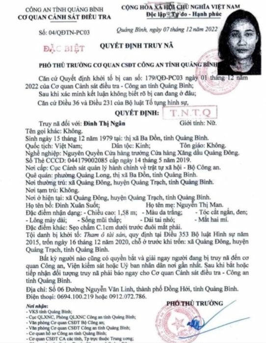 (PLVN) - Công an Quảng Bình ra Quyết định truy nã đặc biệt đối tượng Đinh Thị Ngân (SN 1979) trú tại xã Quảng Đông, huyện Quảng Trạch về tội “Tham ô tài sản”, đã bỏ trốn khỏi nơi cư trú.