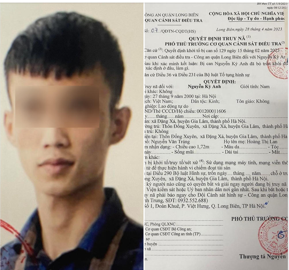 Ngày 10/6, Cơ quan Cảnh sát điều tra, Công an quận Long Biên (Hà Nội) đã thông báo Quyết định truy nã đối với Nguyễn Kỳ Anh (sinh năm 2000 ở xã Đặng Xá, huyện Gia Lâm, TP Hà Nội) về tội Sử dụng mạng máy tính, mạng viễn thông, phương tiện điện tử để thực hiện hành vi chiếm đoạt tài sản.