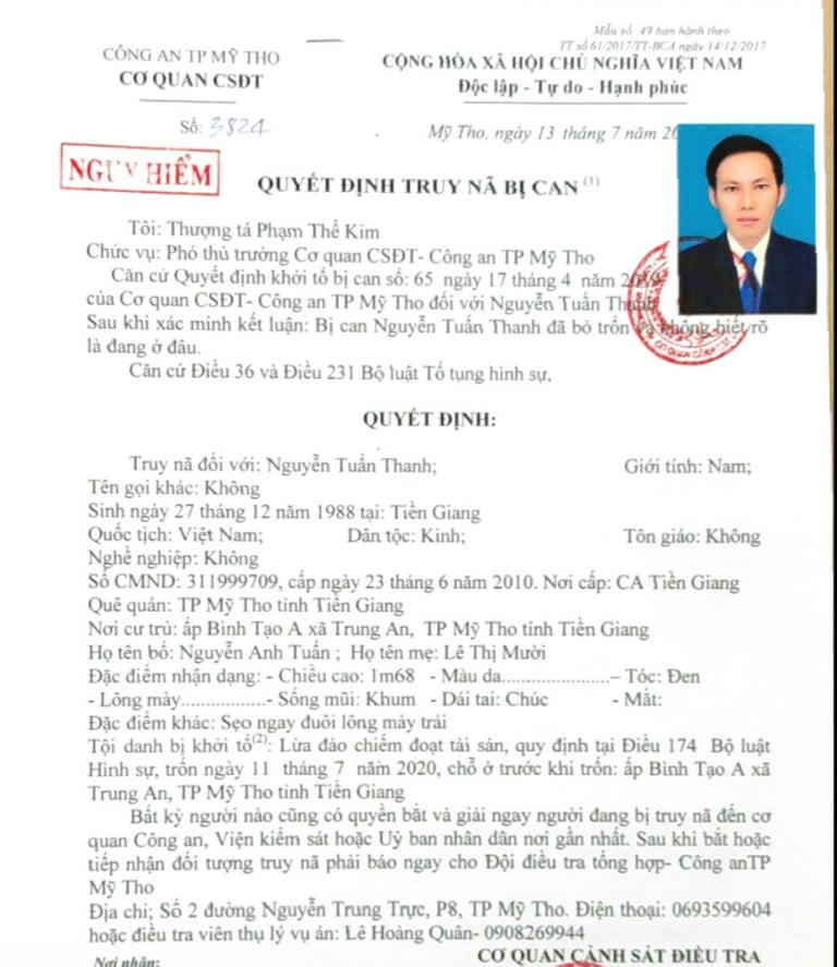 Sau khi điều tra, xác minh, làm rõ vụ việc, ngày 13/07/2020, Cơ quan Cảnh sát điều tra Công an thành phố Mỹ Tho ra quyết định truy nã Nguyễn Tuấn Thanh.