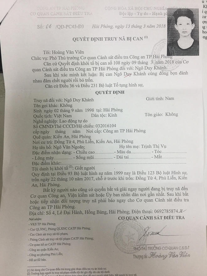 Ngày 19-3, Cơ quan CSĐT Công an TP Hải Phòng cho biết đã ra Quyết định truy nã đối với Ngô Duy Khánh, 30 tuổi, trú tại Đồng Tử 4, phường Phù Liễn (quận Kiến An, TP Hải Phòng) về tội Giết người, quy định tại Điều 123 Bộ luật Hình sự. Đặc điểm nhận dạng của Khánh là có nốt ruồi cách 2 cm dưới đầu mắt phải.