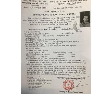 Tuy nhiên, đối tượng đã bỏ trốn khỏi nơi cư trú, hiện không rõ tung tích ở đâu. Ngày 05/5/2023, Cơ quan CSĐT Công an quận Cầu Giấy đã ra quyết định truy nã bị can đối với Ngô Văn Tuyên.