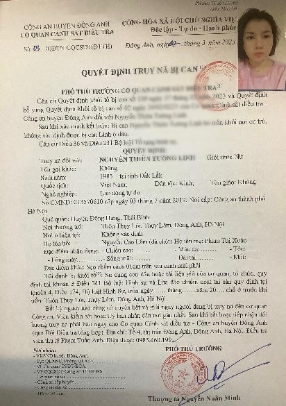 Ngày 07/3/2023, Cơ quan Cảnh sát điều tra Công an huyện Đông Anh đã ra Quyết định truy nã đối với Nguyễn Thiên Tường Linh.