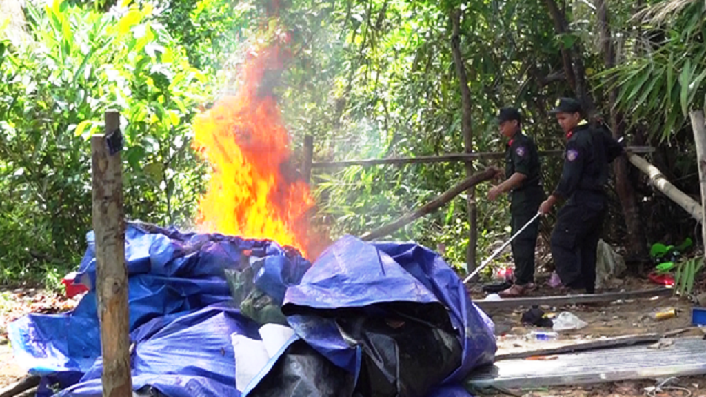 Lực lượng chức năng tiêu hủy lán trại của "vàng tặc". |