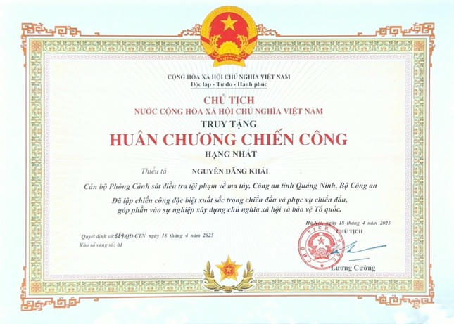 Chiều 18/4, Chủ tịch nước Lương Cường ký Quyết định về việc truy tặng Huân chương Chiến công hạng Nhất cho Thiếu tá, liệt sĩ Nguyễn Đăng Khải (Phòng Cảnh sát điều tra tội phạm về ma túy, Công an tỉnh Quảng Ninh), đã lập chiến công đặc biệt xuất sắc trong chiến đấu và phục vụ chiến đấu, góp phần vào sự nghiệp xây dựng Chủ nghĩa xã hội và bảo vệ Tổ quốc.