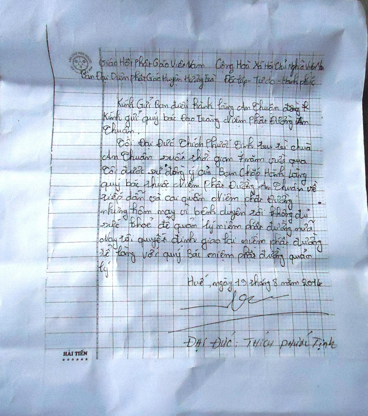 Ông Nguyễn Trấn (80 tuổi, Trưởng Ban giám sát chùa) cho biết, không biết vì chuyện em trai hay vì bệnh nặng mà ngày 19/8/2014, sư trụ trì viết giấy trả lại chùa cho làng cai quản. Hiện các thành viên trong Ban hộ niệm hàng ngày thay nhau nhang khói, vệ sinh, mở cửa để đạo tràng tới sinh hoạt. Vừa rồi có 2 sư cô về chùa xin trụ trì nhưng dân làng vẫn chưa đồng ý.