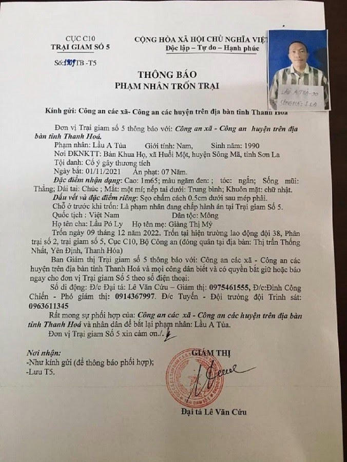 Trại giam số 5 đã phát thông báo truy tìm phạm nhân trốn trại Lầu A Tủa. Đối tượng cao 1,65cm, da ngăm đen, tóc ngắn, sống mũi thẳng, mắt một mí, khuôn mặt hình chữ nhật, sẹo chấm cách 0,5cm dưới mép phải.