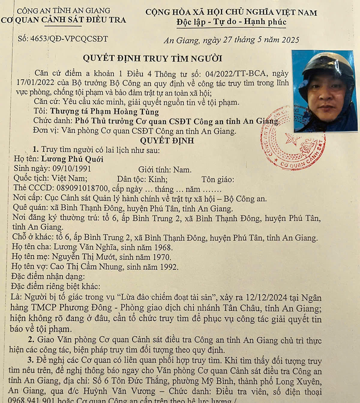 Cơ quan Cảnh sát điều tra Công an tỉnh An Giang đề nghị cá nhân, cơ quan, tổ chức biết thông tin về đối tượng Lương Phú Quới đang ở đâu, thông báo ngay cho Cơ quan Cảnh sát điều tra Công an tỉnh An Giang (qua Văn phòng Cơ quan Cảnh sát điều tra, địa chỉ: Số 6 Tôn Đức Thắng, phường Mỹ Bình, TP. Long Xuyên, tỉnh An Giang) hoặc Điều tra viên Huỳnh Văn Vương (số điện thoại: 0968.941.901) để tiếp nhận xử lý theo quy định.