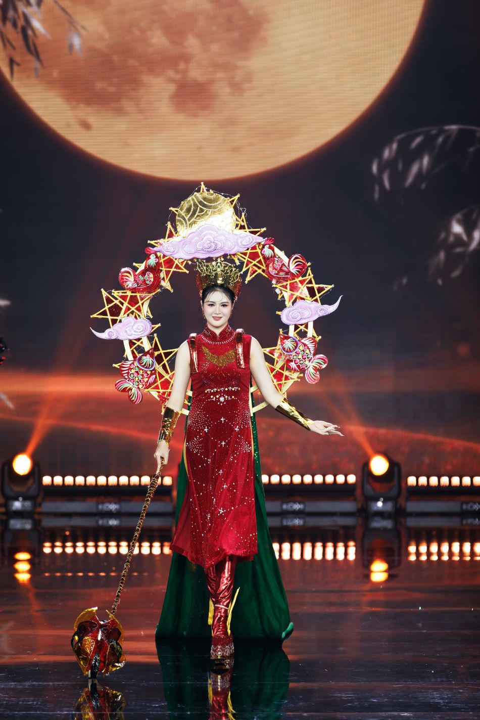 | Trang phục Đêm thu được lấy cảm hứng từ dịp lễ Tết trung Thu, với nhiều chi tiết gắn liền với tuổi thơ của mọi người như đèn, trăng... |