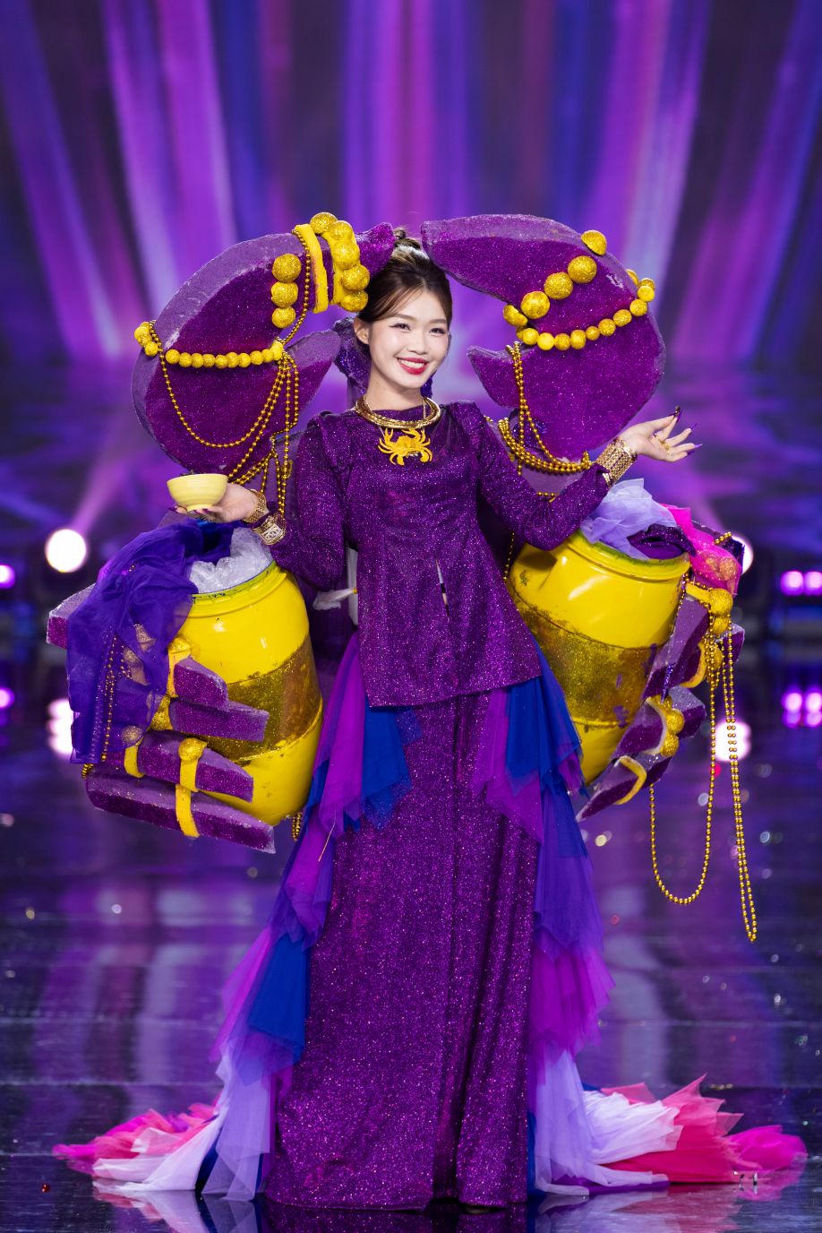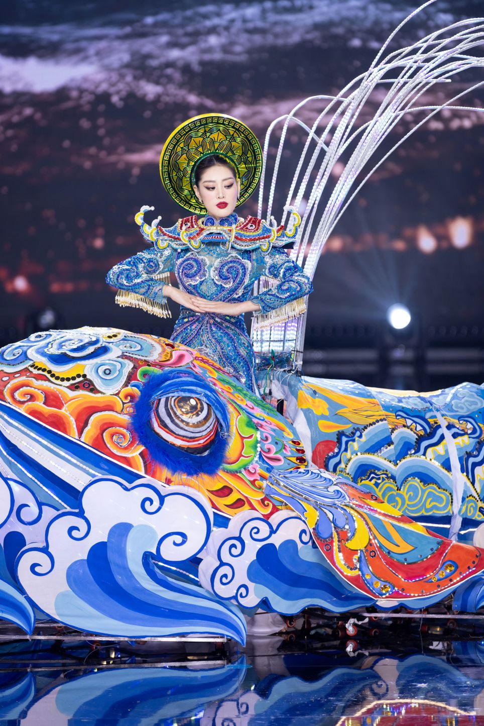 | Hoa hậu Nguyễn Trần Khánh Vân diện thiết kế Nam Hải Ngọc Lân, thay lời tác giả truyền tải thông điệp bảo tồn cá voi là một phần rất quan trọng trong vấn đề chống biến đổi khí hậu. |