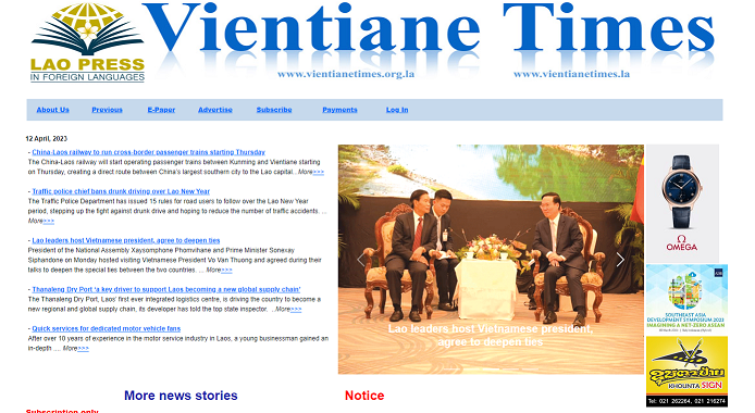 Việc Chủ tịch nước Võ Văn Thưởng gặp gỡ các lãnh đạo chủ chốt của Lào trong chuyến thăm được đăng trang trọng trên trang chủ tờ Vientiane Times ngày 12/4. (Ảnh chụp màn hình) |
