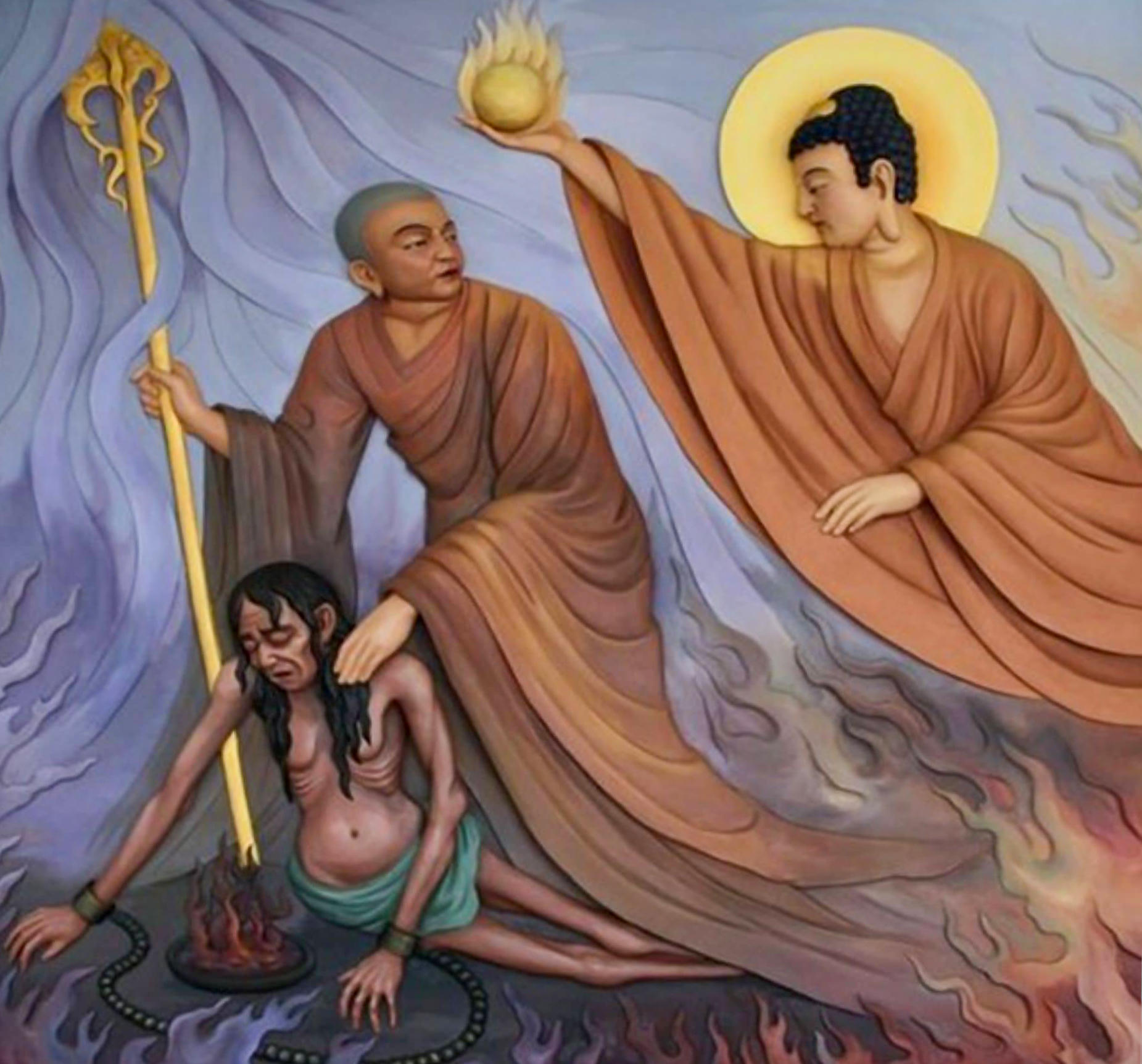 Tranh phật giáo Bồ tát Mục Kiền Liên cứu mẹ.