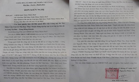 (PLO) - Sáng 11/7, Hội đồng Trị sự Nguyễn Phước tộc đã làm đơn kiến nghị gửi UBND tỉnh Thừa Thiên - Huế và các ngành chức năng đề nghị lãnh đạo tỉnh xem xét, chỉ đạo đơn vị đầu tư khôi phục lại ngôi mộ của bà Tài nhân Cửu giai họ Lê Thị Thụy Thục Thuận, tức vợ vua Tự Đức ngay tại vị trí phát hiện huyệt mộ ở dự án Bãi đậu xe khách tham quan lăng Tự Đức và Đồng Khánh (phường Thủy Xuân, TP. Huế).