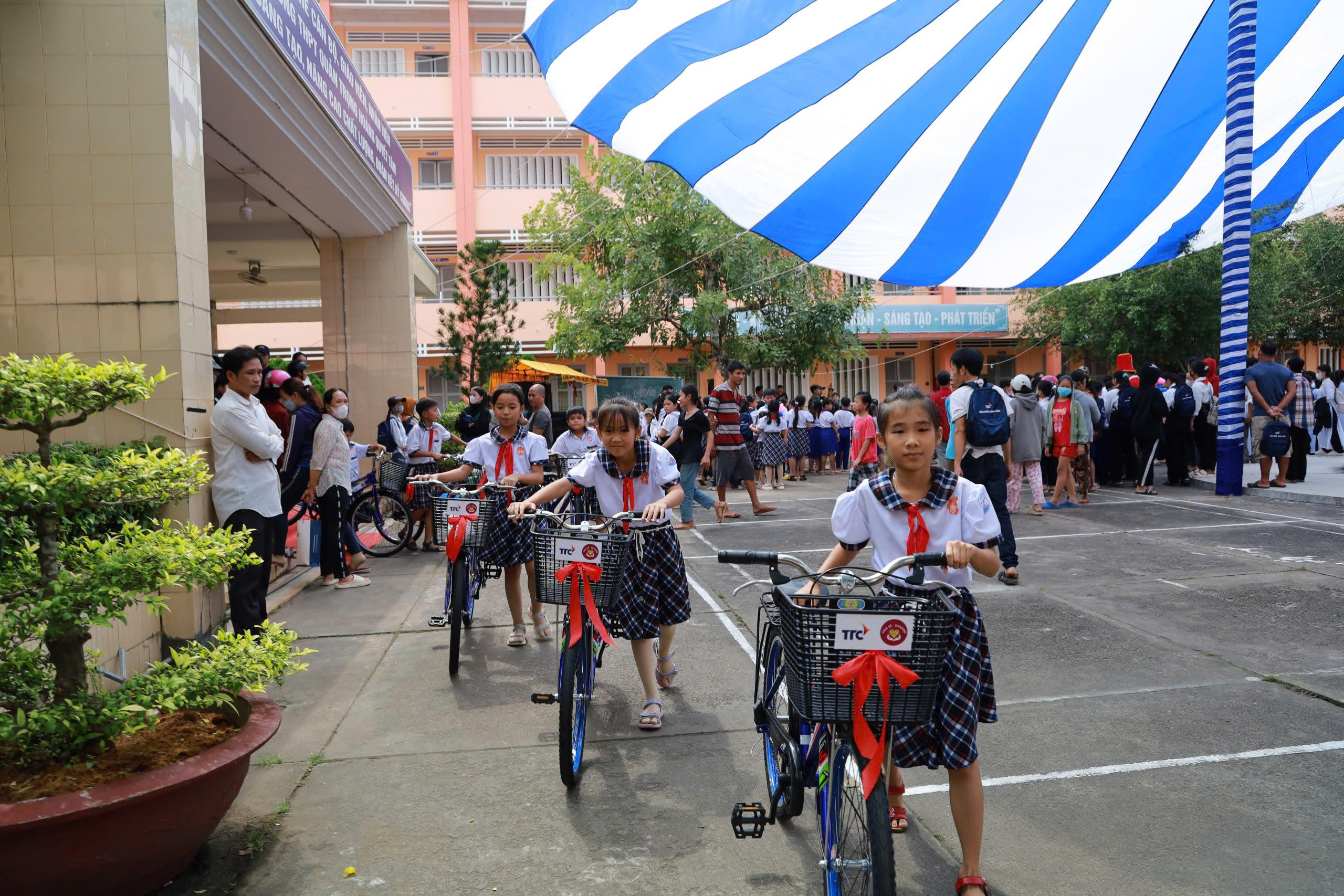 Bà Huỳnh Bích Ngọc - Phó Chủ tịch thường trực Tập đoàn TTC trao tặng xe đạp cho các em học sinh. |
