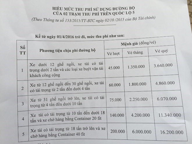 Theo đó, đối với Quốc lộ 5, mức phí áp dụng từ 1/4 tăng bình quân 50% so với mức thu trước kia. Riêng đối với xe tải có tải trọng từ 18 tấn trở lên và xe chở hàng băng container 40feet (xe loại 5) thì mức tăng là 25% so với trước. Mức phí cao nhất của tuyến đường này là xe tải trên 18 tấn, xe container có vé 200.000 đồng/lượt và thấp nhất với xe dưới 12 chỗ là 45.000 đồng/lượt.
