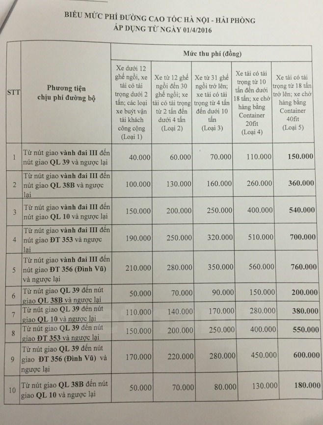 Đối với đường cao tốc Hà Nội-Hải Phòng, từ ngày 1/4 sẽ không thực hiện giảm phí 25% cho giai đoạn đầu khai thác, mức thu phí đường cao tốc là 2.000 đồng/km/xe tiêu chuẩn, tương đương với mức thu phí đường cao tốc Thành phố Hồ Chí Minh-Long Thành-Dầu Giây đã áp dụng từ năm 2015.