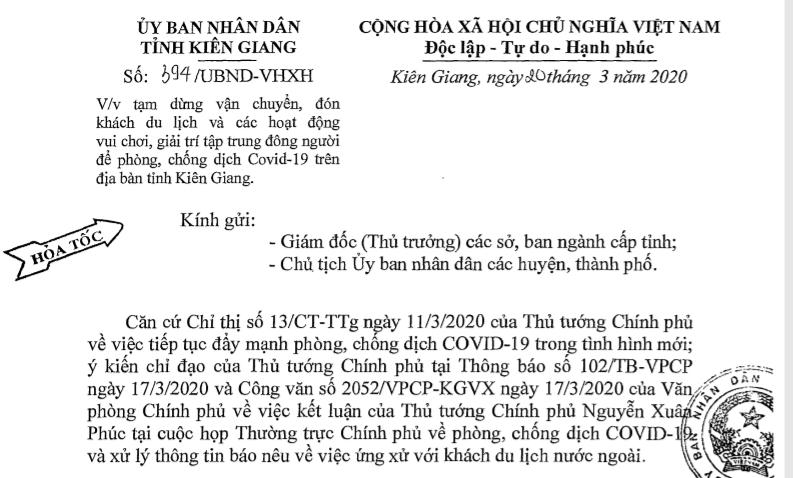 UBND tỉnh Kiên Giang đã ban hành công văn số 394/UBND-VHXH về việc tạm dừng, vận chuyển, đón khách du lịch và các hoạt động vui chơi, giải trí tập trung đông người để phòng, chống dịch Covid-19 trên địa bàn tỉnh.