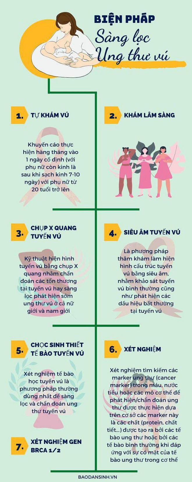 Theo đó, tài liệu nhấn mạnh các biện pháp sàng lọc ung thư vú bao gồm: Phụ nữ từ 20 tuổi trở lên phải tự rèn cho mình một thói quen tự khám vú vào một ngày cố định sau kỳ kinh nguyệt tầm 7-10 ngày, nếu thấy nghi ngờ cần nhanh chóng đến cơ sở y tế để được khám sàng lọc, siêu âm, chụp X-quang tuyến vú, xét nghiệm, sinh thiết để tìm tế bào ung thư nếu cần thiết.