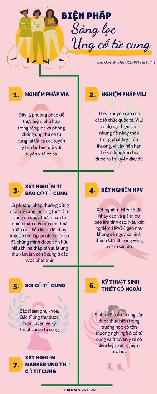 Với ung thư cổ tử cung thì biện pháp sàng lọc là các nghiệm pháp Via, Vili, xét nghiệm tế bào cổ tử cung, soi cổ tử cung, xét nghiệm, sinh thiết để tìm tế bào ung thư nếu cần thiết.