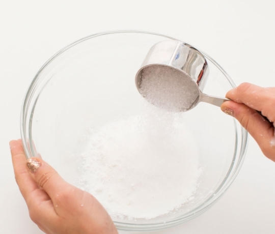 Bạn chuẩn bị một lọ thủy tinh có nắp, cho muối Epsom (một chất khoáng thiên nhiên) vàbaking soda vào lọ. Cho thêm 20 giọt tinh dầu theo sở thích để tạo mùi hương dễ chịu. Đóng nắp lại và sau đó lắc đều lên là xong hỗn hợp bột giặt quần áo rồi.