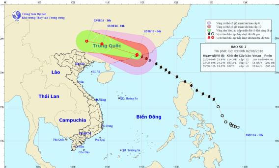 (PLO) - Trung tâm dự báo Khí tượng thuỷ văn Trung ương cho biết, hồi 04 giờ ngày 2/8, vị trí tâm bão số 2 đã ở vào khoảng 22,6 độ Vĩ Bắc; 114,3 độ Kinh Đông, trên vùng bờ biển tỉnh Quảng Đông, cách Hồng Kông khoảng 30km về phía Bắc Đông Bắc. Sức gió mạnh nhất ở vùng gần tâm bão mạnh cấp 11-12 (105-135km/giờ), giật cấp 14-15.