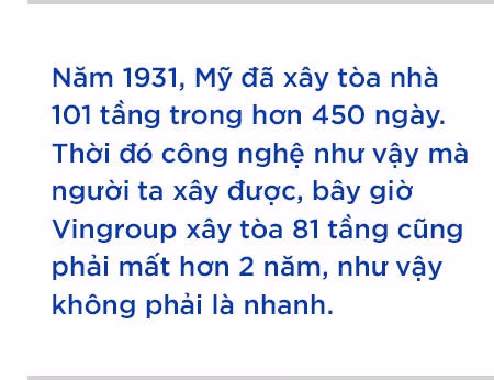 Ông Phạm Nhật Vượng đã đưa ra một so sánh bất ngờ: “Năm 1931, Mỹ đã xây tòa nhà 101 tầng trong hơn 450 ngày. Thời đó công nghệ như vậy mà người ta xây được, bây giờ Vingroup xây tòa 81 tầng cũng phải mất hơn 2 năm, như vậy không phải là nhanh”.