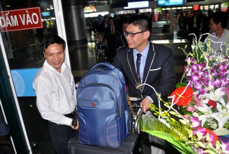 (PLO) - Trưa ngày (14/7), đội tuyển Việt Nam tham dự kỳ thi Olympic Toán học quốc tế (IMO) năm 2014 tại Nam Phi đã về tới Hà Nội. Ra đón đoàn tại sân bay Nội Bài, ngoài gia đình, bạn bè của các thành viên đội tuyển, còn có lãnh đạo Bộ Giáo dục và Đào tạo, lãnh đạo một số tỉnh có học sinh tham gia đội tuyển…