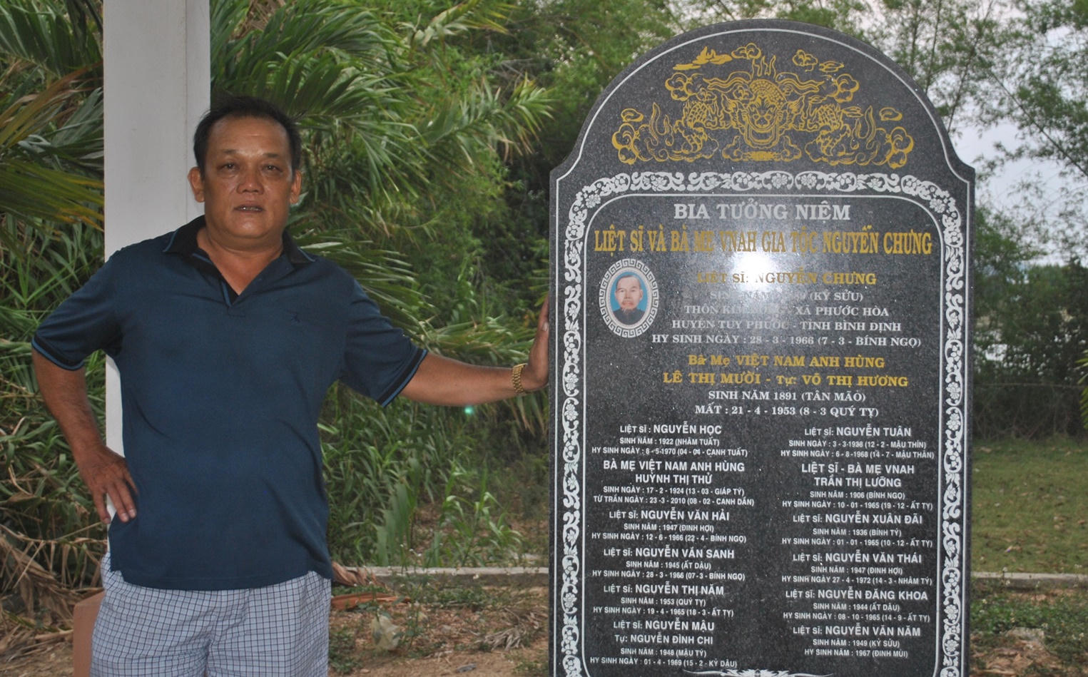 Khu vườn của gia đình liệt sĩ Nguyễn Chưng (SN 1889, xã Phước Hòa, huyện Tuy Phước, tỉnh Bình Định) nằm lọt thỏm giữa vùng đất trũng của thôn Kim Đông, đằng trước là đồng ruộng, phía sau là dòng sông. Tại khu vườn, bia tưởng niệm gia tộc được xây dựng kiên cốở nơi trang nghiêm nhất.