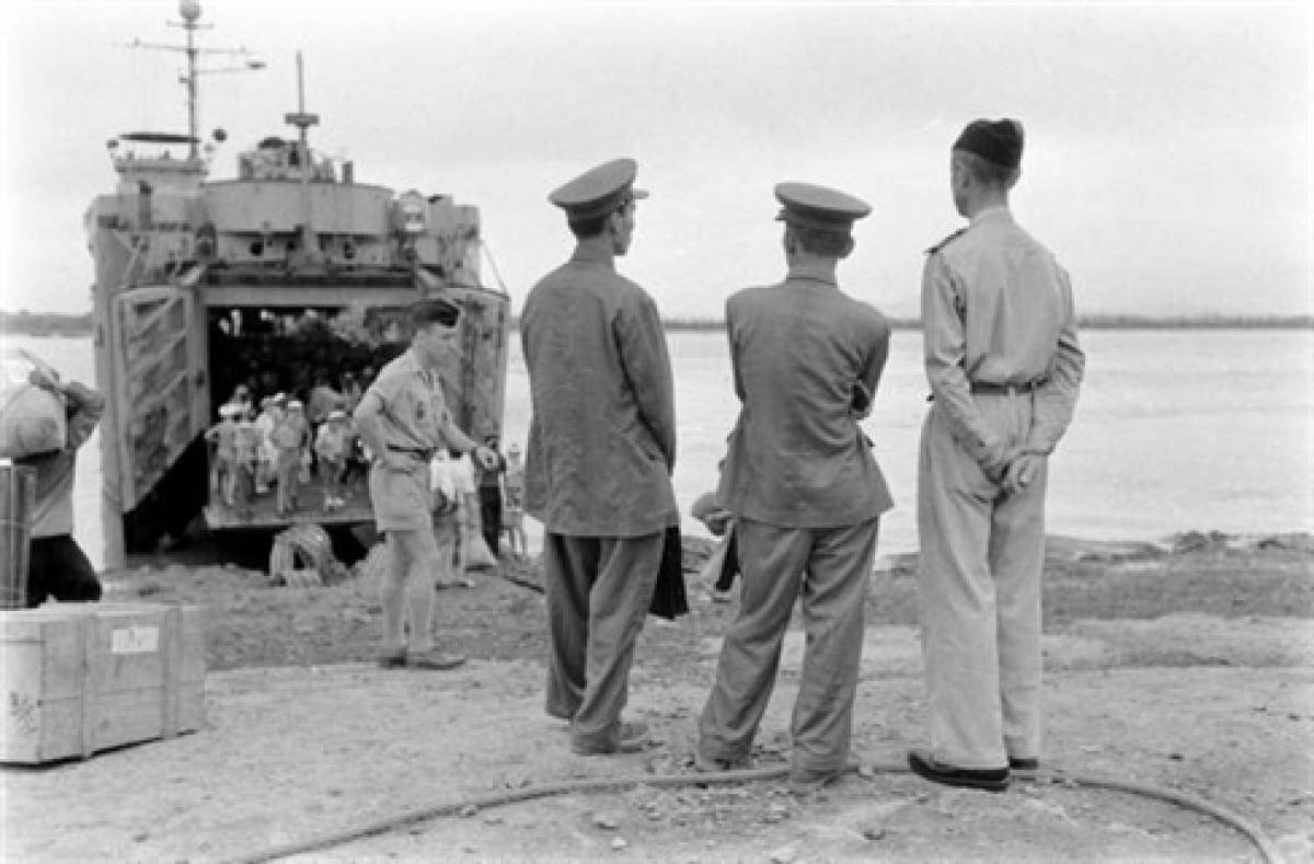 Những lính Pháp cuối cùng lên tàu rời khỏi Hải Phòng dưới sự giám sát của hai sỹ quan quân đội nhân dân Việt Nam tại Bến Nghiêng. |