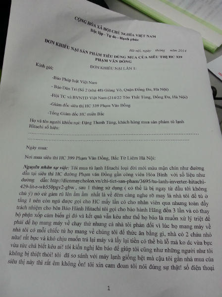 (PLO) - Báo Pháp Luật Việt Nam vừa nhận được đơn thư khiếu nại của khách hàng Đặng Thanh Tùng (52 xóm Chùa, thôn Nhật Tảo, P.Đông Ngạc, Từ Liêm) về việc tủ lạnh Hitachi vừa mua tại siêu thị điện máy HC đã “kêu như bò”.